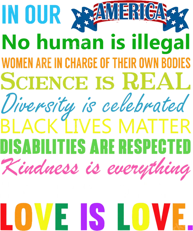 See allThis vibrant DTF transfer proudly displays a powerful message of inclusion and equality. Featuring phrases like "No human is illegal," "Science is REAL," "Black Lives Matter," "Hate has no home," and "Love is Love," it champions progressive values in bold, colorful typography, framed by an "In Our America" banner. This ready to press heat transfer is perfect for making a statement with your apparel. Ideal for activists, advocates, and anyone who believes in a compassionate and equitable society, this design is perfect for rallies, community events, or everyday wear to showcase your convictions. It makes a thoughtful gift for friends, family, or colleagues who share these important values, suitable for birthdays, holidays, or just because. Applying this direct to film transfer is effortless. It can be easily pressed onto a wide variety of fabrics, including cotton, polyester, and blends, using a standard heat press at 300-325°F for 15 seconds with medium pressure. For smaller items or home use, a household iron can also be used, though a heat press is recommended for best results. No tedious weeding or layering required! Crafted with professional-grade DTF film, this heat press design ensures brilliant colors that remain vibrant wash after wash without cracking or peeling. The print boasts a soft hand feel, integrating seamlessly with your garment. Our high-quality iron on decals provide exceptional adhesion and durability, delivering a professional finish every time.