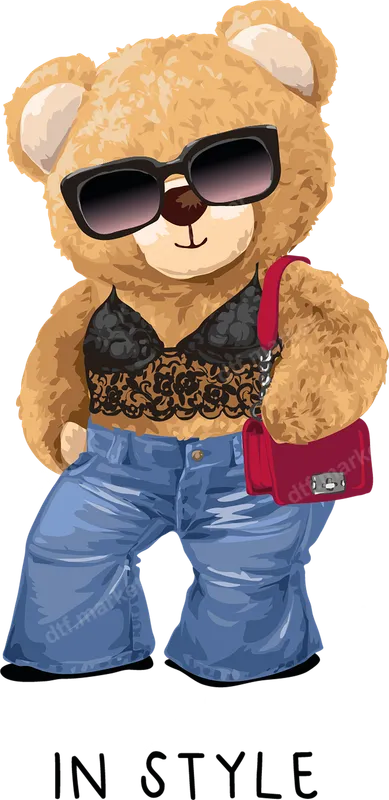 See allEmbrace cutting-edge fashion with our 'In Style' teddy bear DTF transfer. This chic design features a confident teddy bear sporting cool sunglasses, a black lace bralette, trendy wide-leg jeans, and a vibrant red shoulder bag, all beneath the empowering text "IN STYLE." It's the perfect ready to press graphic for adding a touch of playful sophistication and streetwear flair to any garment. This trendy design is ideal for fashion enthusiasts, streetwear lovers, Y2K trend followers, and anyone looking to express their unique style. Perfect for casual wear, music festivals, gifts for friends, or simply making a bold personal statement, this heat transfer design brings a fresh vibe to your wardrobe. Elevate your apparel for everyday outings or special occasions with this eye-catching graphic. Our premium DTF transfers are designed for easy application across a variety of fabrics, including cotton, polyester, and blends. Simply apply with a heat press at 300-325°F for 15 seconds with medium pressure. No complicated weeding or layering like with vinyl transfers – just press and peel. Achieve professional-quality custom apparel in minutes, whether you're a seasoned crafter or a beginner. Experience exceptional quality with our direct to film transfer. Each heat press design boasts vibrant colors, superior detail, and outstanding durability, ensuring your design resists cracking, fading, and peeling wash after wash. The soft-touch finish integrates seamlessly with the fabric, providing a comfortable feel. This apparel transfer ensures your creations look professionally made and last for a long time.
