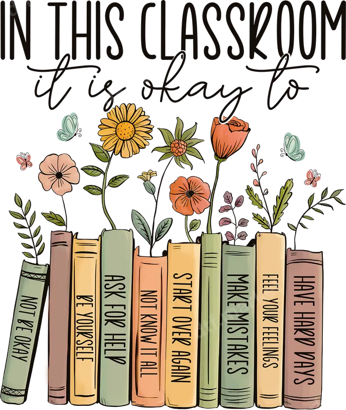 See allThis inspiring DTF transfer features the heartwarming phrase "IN THIS CLASSROOM it is okay to" presented above a charming row of books. Each book spine beautifully illustrates a different message of self-acceptance and growth, such as "NOT BE OKAY," "BE YOURSELF," "ASK FOR HELP," "MAKE MISTAKES," and "HAVE HARD DAYS." Delicate flowers and butterflies emerge from the books, creating a gentle and nurturing aesthetic. This ready to press design is perfect for fostering a supportive environment. This empowering design is ideal for teachers, school counselors, administrators, and childcare providers looking to create a welcoming and inclusive space. It makes a thoughtful gift for educators, for back-to-school season, teacher appreciation week, or as an end-of-year present. Parents can also use this design to personalize items for their children's classrooms or for their own home learning areas, promoting emotional intelligence and resilience. Our high-quality DTF transfers are designed for easy application on a wide range of fabrics, including cotton, polyester, and various blends. Applying this heat press design is simple: use a heat press at 300-325°F for 15 seconds with medium pressure, then perform a cool peel. For those without a professional heat press, this iron on transfer can also be applied with a household iron with care. Enjoy a professional finish without the hassle of weeding, making it a truly ready to press transfer. Experience superior quality with our direct to film transfers. Each t-shirt transfer boasts vibrant colors, exceptional durability, and resistance to cracking or fading, ensuring your apparel transfer looks fantastic wash after wash. The soft-touch feel integrates seamlessly with the garment, providing maximum comfort. Professional-grade DTF film and strong adhesive guarantee a long-lasting custom transfer for your projects.