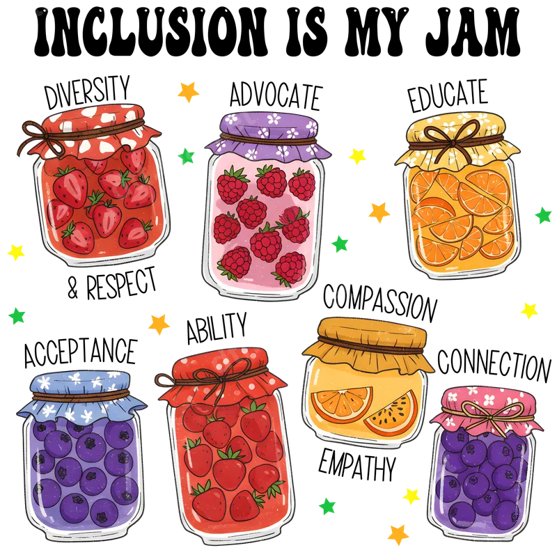 See allThis vibrant "Inclusion Is My Jam" DTF transfer showcases fruit-filled jars, each embodying a core value of inclusivity: Diversity & Respect, Advocate, Educate, Acceptance, Ability, Compassion Empathy, and Connection. The playful design and bold, retro-inspired phrase create a positive statement. This high-quality DTF transfer is ready to press, perfect for personalizing apparel with a meaningful message. Ideal for teachers, activists, community organizers, or anyone championing diversity and acceptance, this heat transfer makes a powerful statement. It's excellent for school events, awareness campaigns, pride celebrations, or as a thoughtful gift. Spread positivity and advocate for important values on your favorite garments. Applying this direct to film transfer is straightforward, working beautifully on cotton, polyester, and blends. For best results, use a heat press at 300-325°F for 15 seconds with medium pressure. A household iron can also be used, but a heat press ensures optimal adhesion. There's no weeding required, saving you time and effort. Crafted with professional-grade DTF film and vibrant, eco-friendly inks, this t-shirt transfer promises exceptional durability and a soft-to-touch finish. Colors are brilliant, long-lasting, and resist cracking, peeling, and fading through countless washes. Our iron on transfer delivers a premium look, ensuring your message of inclusion shines brightly on any customized item.