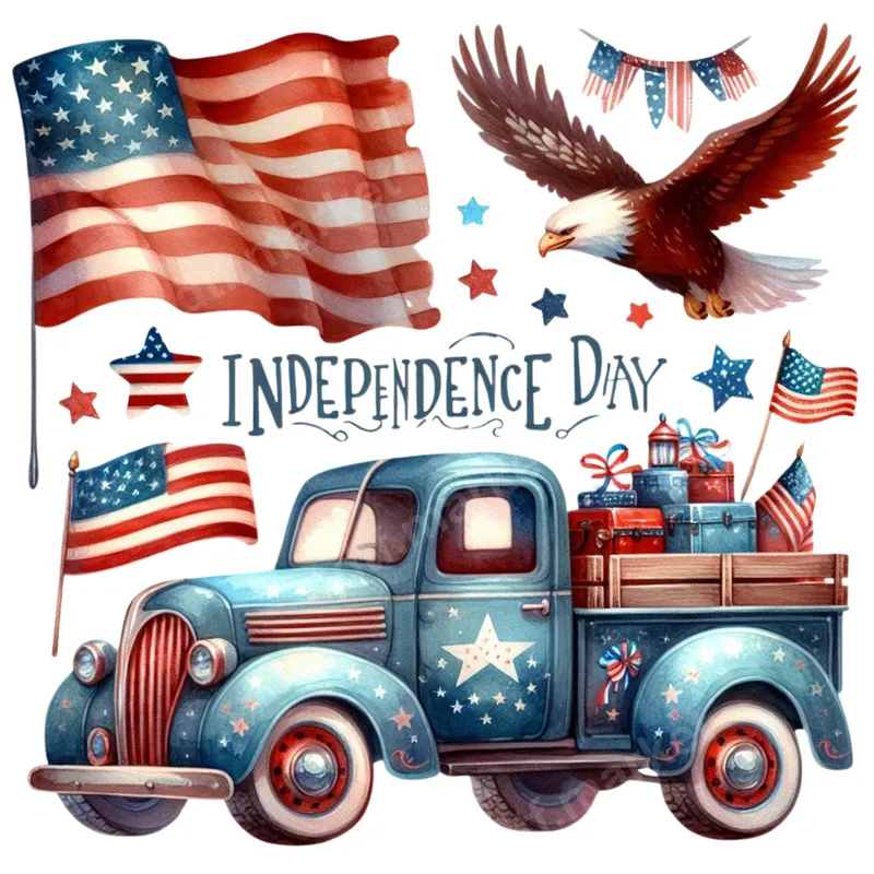 See allThis captivating direct to film transfer showcases a heartwarming Independence Day scene, featuring a vintage blue pickup truck adorned with stars and stripes, loaded with festive red and blue gifts. Overhead, a majestic bald eagle soars alongside waving American flags and patriotic bunting, with the elegant script 'INDEPENDENCE DAY' tying the entire design together. Rendered in a beautiful watercolor style, this ready to press transfer exudes a nostalgic and celebratory American spirit, perfect for honoring national pride. Ideal for patriots, veterans, and anyone who loves Americana, this heat press transfer is perfect for celebrating the Fourth of July, Memorial Day, or any occasion that calls for a display of national pride. Create custom apparel for family gatherings, community events, or festive parades. It makes a thoughtful and unique gift for friends and loved ones who cherish American values and vintage aesthetics, allowing them to showcase their patriotism on any garment. Applying this vibrant iron on transfer is incredibly simple and requires no weeding, making customization quick and hassle-free. It adheres beautifully to a wide range of fabrics, including cotton, polyester, and various blends, ensuring versatility for your projects. For best results, use a heat press at 280-300°F for 6-10 seconds with medium pressure, then perform an instant hot peel. A household iron can also be used with firm, even pressure for those without a professional press. Experience superior quality with this professional t-shirt transfer, crafted using premium DTF film and strong adhesive. The colors are incredibly vibrant and true to the watercolor artistry, ensuring your finished garment stands out. Designed to be crack-resistant and soft to the touch, this apparel transfer offers exceptional durability and comfort. Enjoy a long-lasting, high-definition design that will withstand numerous washes, making your custom creations truly professional and cherished.