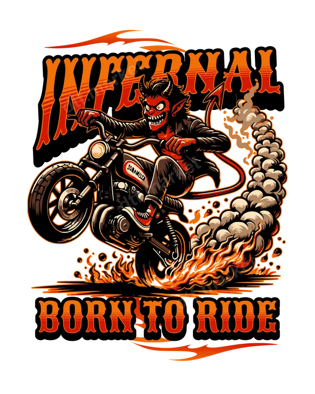 See allThis dynamic DTF transfer features an edgy, red devil character on a classic motorcycle, kicking up fiery flames and a trail of smoke. Above the infernal rider, the bold text "INFERNAL" is emblazoned in a striking, vintage-style font, complemented by "BORN TO RIDE" below, embodying a rebellious spirit. This ready to press design perfectly captures the thrill and defiance of the open road, making a powerful visual statement. Unleash your inner rebel with this unique heat press transfer, ideal for motorcycle enthusiasts, rock and metal music fans, and anyone who loves a dark, vintage aesthetic. It's a fantastic choice for personalizing apparel for biker rallies, concerts, or simply adding a bold touch to your everyday wardrobe. This eye-catching iron on decal also makes a perfect gift for the adventurous spirits in your life. Applying this vibrant design is straightforward. Our high-quality DTF transfers work seamlessly on a wide range of fabrics, including cotton, polyester, and various blends. For best results, use a heat press at 300-325°F for 15 seconds with medium pressure, then cold peel the film. A household iron can also be used with care. Enjoy a professional finish without the hassle of weeding, making it an efficient choice for creating custom apparel. Crafted with premium professional DTF film, this apparel transfer ensures exceptional quality. The colors are incredibly vibrant and will resist cracking and fading, maintaining their striking appearance wash after wash. The transfer boasts a soft-to-touch finish and a strong adhesive, guaranteeing a durable and long-lasting design that will stand out wherever your journey takes you.