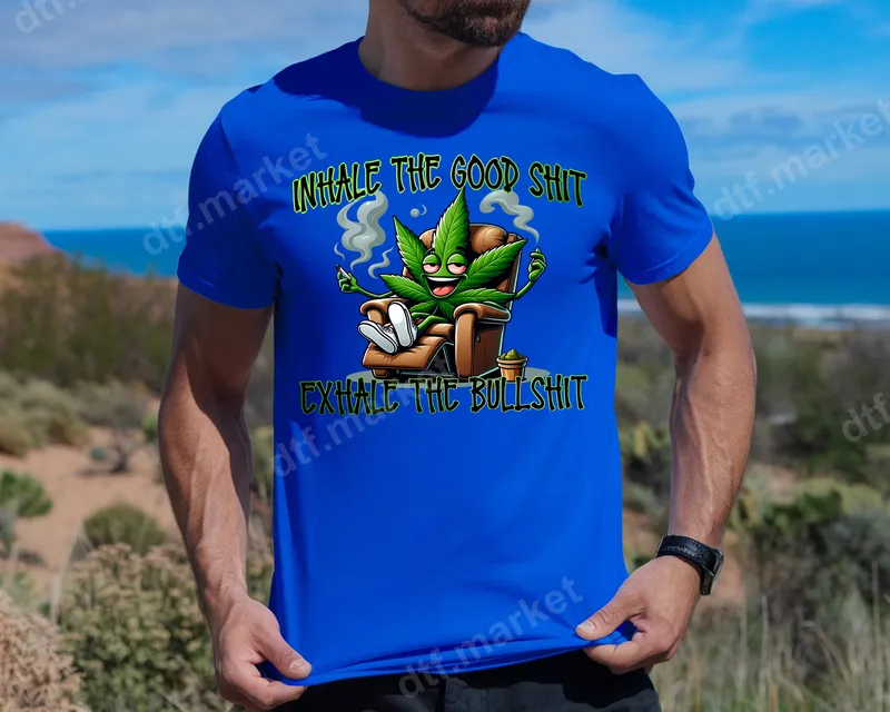 See allThis vibrant DTF transfer features a chill cartoon cannabis leaf character, comfortably seated in an armchair, with smoke wafting from its joint. The design boldly states "INHALE THE GOOD SHIT" above and "EXHALE THE BULLSHIT" below, capturing a relaxed, humorous, and slightly edgy vibe. This high-quality DTF transfer is ready to press, allowing you to instantly customize your apparel with a unique statement. This funny iron on transfer is perfect for cannabis enthusiasts, those with a laid-back attitude, or anyone who appreciates adult humor and a good laugh. It makes an excellent gift for birthdays, 420 celebrations, or just because. Ideal for personalizing your wardrobe for festivals, casual outings, or simply enjoying a relaxed day at home. This heat press design offers a unique way to express your personality. Applying this apparel transfer is simple and efficient. Our heat press ready designs work flawlessly on a wide variety of fabrics, including cotton, polyester, and cotton/poly blends. For best results, use a heat press at 300-325°F for 15 seconds with medium pressure. It can also be applied with a high-quality household iron, following included instructions. No tedious weeding or complex layering, making customization quick and hassle-free. Experience professional-grade results with our premium DTF transfers. Each design boasts vibrant colors that pop, superior crack resistance, and a soft, flexible feel on the garment. Crafted with durable DTF film and strong adhesive, these transfers ensure a long-lasting finish that withstands washes and wear. This ready to press transfer provides a durable, high-quality addition to any garment or accessory, rivaling screen prints.
