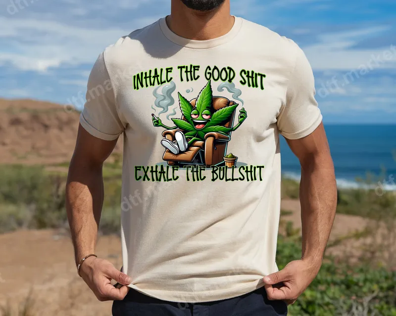 See allThis vibrant DTF transfer showcases a chill cannabis leaf character, happily smoking in an armchair, alongside the bold, humorous text: "INHALE THE GOOD SHIT EXHALE THE BULLSHIT." This direct to film transfer captures a laid-back vibe, perfect for anyone who appreciates a good laugh and a relaxed attitude. It's a ready to press design that brings instant personality to any garment. This unique heat transfer is ideal for cannabis enthusiasts, those who enjoy adult humor, or anyone seeking a fun, expressive shirt design. It makes a fantastic gift for birthdays, 4/20 celebrations, or simply as a treat for yourself. Perfect for friends with a great sense of humor or as a statement piece for weekend wear. Applying this heat press transfer is incredibly easy, whether you're a seasoned pro or new to custom apparel. Our high-quality DTF transfers work seamlessly on cotton, polyester, and blends. For best results, use a heat press at 300-325°F for 15 seconds with medium pressure. It can also be applied with a household iron, though a heat press is recommended for durability. No tedious weeding is required, making customization quick and effortless. Experience professional-grade results with our premium iron on transfer. You’ll love the vibrant colors and sharp details that stand out wash after wash. Crafted from durable DTF film with strong adhesive, this apparel transfer is designed to be crack-resistant and incredibly soft to the touch, ensuring longevity for your custom creations. Enjoy a long-lasting, high-quality garment that looks and feels great.