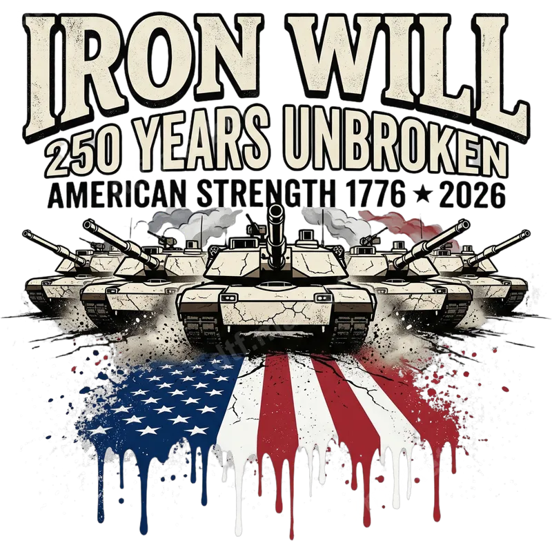 See allThis powerful "Iron Will American Strength" DTF transfer proudly displays a fleet of battle-ready tanks advancing over a distressed, dripping American flag. The design proclaims "250 Years Unbroken" and "American Strength 1776 ★ 2026," evoking a strong sense of enduring patriotism and military might. It's a ready to press transfer designed for those who want to express their deep national pride. This bold heat press design is perfect for military veterans, active service members, patriotic Americans, and anyone who cherishes the nation's history and strength. Ideal for Memorial Day, Veterans Day, 4th of July celebrations, or everyday wear to show your support. It makes a thoughtful gift for dads, grandfathers, and friends who embody American resilience and spirit. Applying this versatile heat transfer is straightforward for both professionals and DIY enthusiasts. It adheres beautifully to a wide range of materials, including cotton, polyester, and various blends. For optimal results, use a heat press at 300-325°F for 15 seconds with medium pressure. It's an easy iron on transfer, meaning no tedious weeding required—simply press and peel for a crisp, professional finish. Our direct to film transfers are crafted using premium quality DTF film and inks, ensuring vibrant colors and exceptional durability. The design is crack-resistant, soft to the touch, and built to withstand countless washes without fading. You'll receive a professional-grade apparel transfer that provides a smooth, long-lasting print, transforming any garment into a statement piece of American pride.
