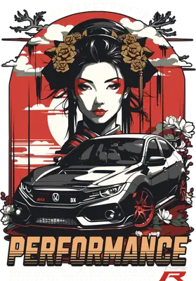 Embrace the fusion of Japanese elegance and high-performance automotive culture with this striking DTF transfer. Featuring a captivating Geisha adorned with gold roses, set against a vibrant red sun and traditional clouds, this design showcases a sleek Honda Civic Type R in the foreground. Bold 'PERFORMANCE' typography anchors the powerful aesthetic, making this a truly unique and ready to press graphic that stands out. It's a perfect blend of artistic tradition and modern JDM enthusiasm.