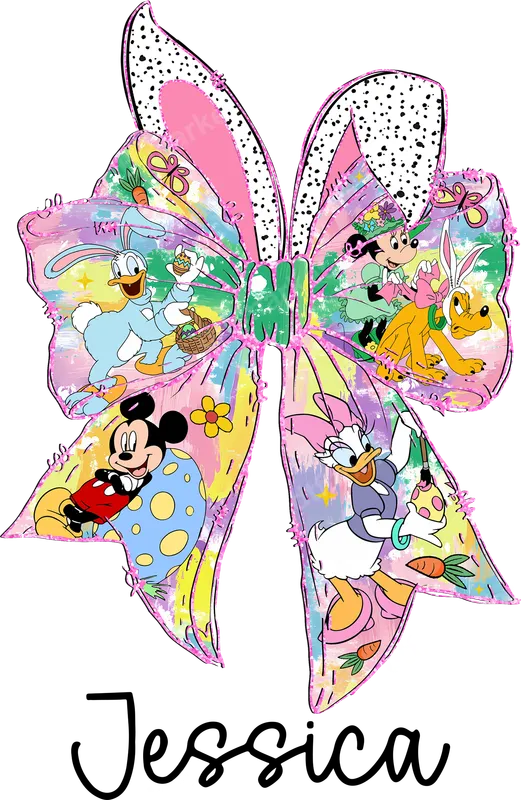 See allDive into the festive spirit of Easter with this enchanting DTF transfer featuring beloved Disney characters. This whimsical design showcases Mickey, Minnie, Donald, Daisy, and Pluto, all dressed in adorable bunny outfits and celebrating with colorful Easter eggs, carrots, and spring flowers. The centerpiece is a large, artistic bow with bunny ears, highlighted by a vibrant, distressed pastel background and charming glittery accents. Below the cheerful scene, the name 'Jessica' is elegantly scripted, adding a personal touch to this delightful ready to press transfer. Perfect for Disney enthusiasts, families, and anyone named Jessica looking to add a unique flair to their Easter celebrations. This versatile heat transfer is ideal for creating custom outfits for Easter egg hunts, family gatherings, or springtime events. It makes a thoughtful and personalized gift for daughters, nieces, or friends who adore classic cartoons and holiday cheer. Imagine this vibrant shirt design bringing smiles and joy to any Easter parade or themed party, making it a standout apparel transfer for the season. Our premium iron on transfer is designed for effortless application, whether you use a professional heat press or a household iron. It adheres beautifully to a wide range of materials, including cotton, polyester, and various fabric blends, ensuring excellent versatility for your crafting projects. For best results, use a heat press at 300-325°F for 15 seconds with medium pressure, followed by a cool peel. No complicated weeding or layering is needed, making your garment decoration quick and enjoyable. Experience superior quality with our direct to film transfers, engineered to deliver exceptional vibrancy and durability. The colors are rich and true to the original design, staying bright even after multiple washes. Our DTF transfers are crack-resistant, ensuring your personalized garments maintain their pristine look over time. The film is incredibly soft to the touch once applied, providing maximum comfort without a heavy feel. You're investing in a professional heat press design that offers a strong, lasting adhesion.