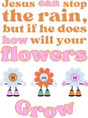 See allEmbrace faith and positivity with this vibrant 'Jesus Can Stop the Rain, but if he does how will your flowers Grow' DTF transfer. This uplifting design features groovy, retro-inspired typography in warm orange and soft pink, complemented by three cheerful cartoon flowers giving thumbs up. It’s a beautifully rendered ready to press transfer that combines a timeless spiritual message with a playful, nostalgic aesthetic, perfect for uplifting any garment. This inspirational heat transfer design is perfect for Christian women, youth groups, Sunday school teachers, or anyone seeking to share a message of hope and perseverance. It makes an excellent gift for Easter, Mother's Day, VBS events, or everyday faith-wear. Crafters and small Christian businesses will find this iron on transfer a fantastic addition to their product lines, offering unique apparel for church gatherings or thoughtful personal gifts. Applying this heat press transfer is simple and efficient on cotton, polyester, blends, and nylon. Use a heat press at 300-325°F for 15 seconds, medium pressure, or apply with a household iron. No weeding is required – just peel and press to create custom t-shirts, hoodies, tote bags, or denim jackets. For lasting durability, wash garments inside out and tumble dry low. Experience superior quality with this premium ready to press transfer. It boasts vibrant, full-color printing, capturing every detail of the groovy typography and charming illustrations. The design is crack-resistant, soft to the touch, and avoids the heavy, stiff feel of vinyl. Each direct to film transfer is produced on high-grade DTF film with a strong adhesive backing, ensuring professional, durable results that stand the test of time and wash.