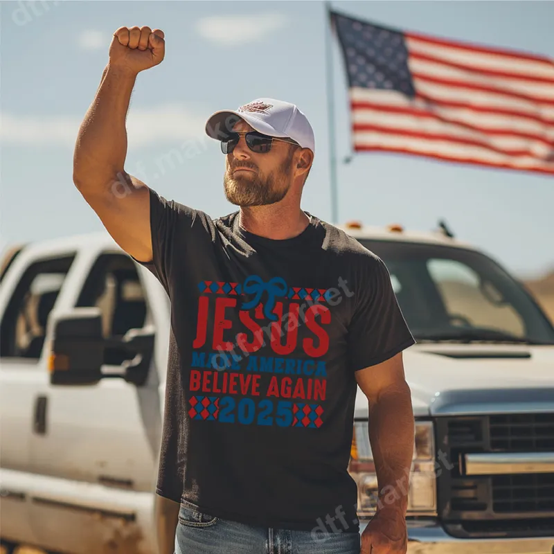 See allExpress your faith and patriotism with our 'Jesus Make America Believe Again 2025' DTF transfer. This powerful design features bold red and blue distressed lettering, accented with unique geometric patterns, embodying a message of hope and spiritual revival for the nation. A subtle bow detail adds a touch of classic Americana. This high-quality direct to film transfer is vibrant, detailed, and completely ready to press onto your favorite garments, providing a professional look with minimal effort. This inspirational heat transfer is perfect for individuals who proudly blend their Christian faith with American patriotism. Ideal for church events, patriotic holidays like the 4th of July, political rallies, or as a meaningful statement piece for everyday wear. It makes an excellent gift for family members, friends, or fellow churchgoers who share a vision for a faith-filled America. Show your conviction and look forward to 2025 with this impactful iron on transfer. Applying this ready to press transfer is simple and efficient. It adheres beautifully to cotton, polyester, and various blends. For best results, use a heat press at 300-325°F for 15 seconds with medium pressure, then cold peel. No intricate weeding is required, saving time compared to traditional vinyl transfers. A household iron can also be used, ensuring even pressure. Our apparel transfer is crafted using professional-grade DTF film and inks, guaranteeing exceptional durability and a stunning finish. The colors remain vibrant wash after wash, resisting cracking and fading over time. You'll appreciate the soft, flexible feel of the design on your garment, which moves with the fabric for ultimate comfort. Invest in a premium t-shirt transfer that stands out and proudly conveys your message with lasting quality.