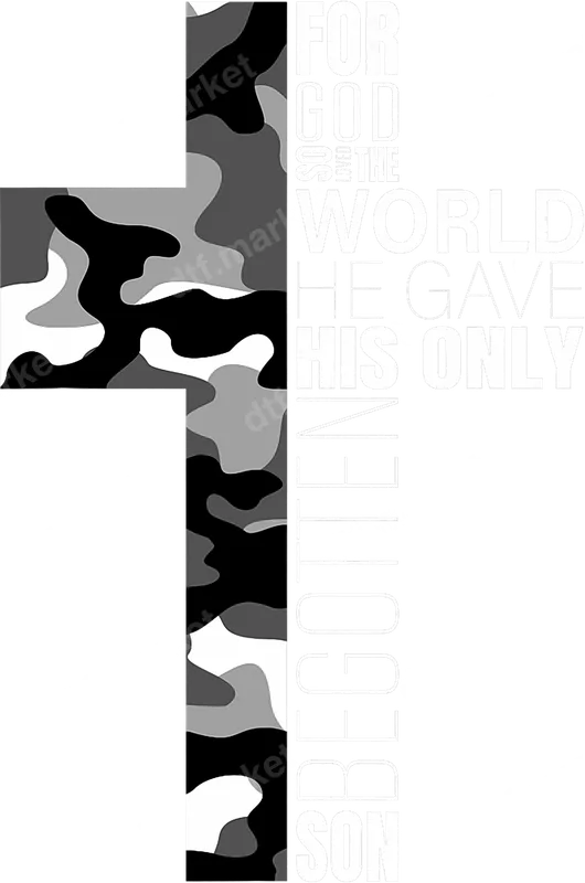 See allThis striking design features a bold Christian cross adorned with a modern black, white, and grey camouflage pattern. Integrated seamlessly, the powerful Bible verse John 3:16 ("FOR GOD SO LOVED THE WORLD HE GAVE HIS ONLY BEGOTTEN SON") is rendered in crisp white typography, creating a profound statement of faith. This high-quality DTF transfer arrives ready to press, combining spiritual inspiration with a rugged, contemporary aesthetic. Perfect for expressing your conviction, this design is ideal for Christians, veterans, active military personnel, and their families. It makes a thoughtful gift for Father's Day, Memorial Day, Easter, or any occasion celebrating faith and patriotism. Small businesses, Etsy sellers, and crafters looking for unique iron on transfer designs will find this an excellent addition to their product line, perfect for creating impactful heat press design apparel for church events, mission trips, or daily wear. Applying this heat press transfer is simple and fast. It adheres beautifully to a wide range of fabrics including cotton, polyester, and their blends, and even nylon. Just use a heat press (300-325°F for 15 seconds, medium pressure) or a household iron. There's no tedious weeding required—simply peel and press for instant results. Use it to personalize custom t-shirts, hoodies, sweatshirts, tote bags, denim jackets, and even canvas utility vests. For lasting durability, wash garments inside out and tumble dry on low. Experience professional results with this premium ready to press transfer. Our advanced printing technology ensures vibrant, full-color reproduction with exceptional detail and crisp lines for the text and camouflage. These transfers are crack-resistant, offer a soft hand feel, and avoid the heavy, stiff sensation of traditional vinyl. Each direct to film transfer is produced on superior DTF film with a robust adhesive backing, ensuring a flawless application and long-lasting wear.