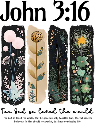 This design elegantly showcases the powerful scripture of John 3:16, "For God so loved the world, that he gave his only begotten Son, that whosoever believeth in him should not perish, but have everlasting life." The verse is beautifully complemented by four contemporary botanical panels, featuring stylized flowers and foliage in a sophisticated palette of soft pinks, warm golds, deep blues, and vibrant greens against contrasting dark and natural backdrops. This eye-catching DTF transfer offers a modern yet timeless way to express faith, arriving ready to press onto your favorite garments. This spiritual iron on transfer is perfect for individuals looking to proudly display their Christian faith with a touch of modern elegance. It makes a thoughtful gift for confirmation, baptism, Easter, Christmas, or just to uplift a loved one. Small t-shirt businesses, craft fair vendors, and Etsy shop owners can easily incorporate this heat transfer design into their inventory to create unique apparel for church groups, women's ministries, or as inspirational gifts. It's an ideal choice for anyone seeking meaningful, visually appealing faith-based apparel. Applying this heat press transfer is straightforward, suitable for cotton, polyester, cotton-poly blends, and even nylon fabrics. For best results, use a heat press at 300-325°F for 15 seconds with medium pressure, or a household iron for smaller applications. The process is simple: just peel and press – no weeding or complex steps required. Create stunning custom t-shirts, cozy hoodies, durable tote bags, personalized pillow covers, or even unique baby onesies and aprons. To maintain the design's integrity, wash garments inside out in cold water and tumble dry on low heat. Experience superior quality with this ready to press transfer, boasting vibrant, full-color printing and exceptional fine detail that truly brings the intricate botanical artwork to life. Our transfers are designed to be crack-resistant and offer a soft, comfortable feel, avoiding the thick, heavy texture often associated with vinyl. Every direct to film transfer is meticulously printed on premium DTF film, ensuring a strong, consistent adhesive backing for professional-grade results on all your apparel projects, wash after wash.