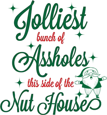 See allThis hilarious DTF transfer features the phrase "Jolliest bunch of Assholes this side of the Nut Houses" in festive green and red script fonts, accented with sparkling star details. A whimsical, outline-style Santa Claus character stands proudly beside the text, adding a touch of classic Christmas charm to this edgy, humorous design. It’s a perfect ready to press transfer for those who love a bit of cheeky humor during the holiday season and aren't afraid to show it. This sarcastic Christmas design is perfect for friends, family, or coworkers with a great sense of humor. Ideal for ugly Christmas sweater parties, family gatherings where everyone knows the real score, or just making a statement throughout December. Small t-shirt businesses, Etsy sellers, and crafters looking for unique heat transfer designs will find this a popular addition to their holiday inventory, perfect for creating memorable custom gifts or group apparel. Applying this heat press transfer is simple and efficient. It works beautifully on a wide range of materials including cotton, polyester, cotton-poly blends, and even nylon. For best results, use a heat press at 300-325°F for 15 seconds with medium pressure, or apply with a household iron. There's no tedious weeding required—simply peel the film and press! Use it to create custom t-shirts, festive hoodies, cozy sweatshirts, unique tote bags, or even funny aprons for holiday cooking. Our ready to press transfer ensures professional-grade results every time. You'll love the vibrant, full-color printing and exceptional fine detail, bringing the humor of this design to life. The durable print is crack-resistant and boasts a soft, lightweight feel, avoiding the heavy texture often associated with vinyl. Each direct to film transfer is meticulously printed on premium DTF film, featuring a strong adhesive backing for long-lasting, high-quality apparel.
