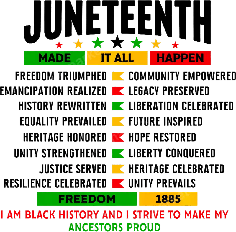 See allCommemorate freedom and heritage with this powerful Juneteenth DTF transfer, proudly proclaiming 'I Am Black History And I Strive To Make My Ancestors Proud.' This ready to press design features 'JUNETEENTH' prominently, surrounded by phrases like 'Freedom Triumphed,' 'Equality Prevailed,' and 'Legacy Preserved' in Pan-African inspired colors. It's a bold statement of pride and historical significance, perfect for celebrating this important day. This meaningful direct to film transfer is ideal for individuals, community organizations, and educators honoring Juneteenth, Black History Month, or expressing African American heritage pride. It makes a thoughtful gift for family, friends, or anyone passionate about social justice and cultural celebration. Perfect for festivals, family gatherings, or everyday wear to inspire and educate. Applying this heat transfer is effortless. Our premium heat press ready design works seamlessly on cotton, polyester, and blends. For best results, use a heat press at 300-325°F for 15 seconds with medium pressure, then peel cold. You can also achieve great results with a household iron (follow instructions). Forget tedious weeding; this iron on transfer comes pre-masked and ready to be pressed directly onto your garment. Experience superior quality with our professional-grade DTF transfers. Each apparel transfer boasts vibrant, crack-resistant inks that won't fade, ensuring your message stays bold for countless washes. The soft-touch finish provides maximum comfort. Crafted with strong adhesive, our custom transfers provide exceptional durability and a smooth, professional look on any item.