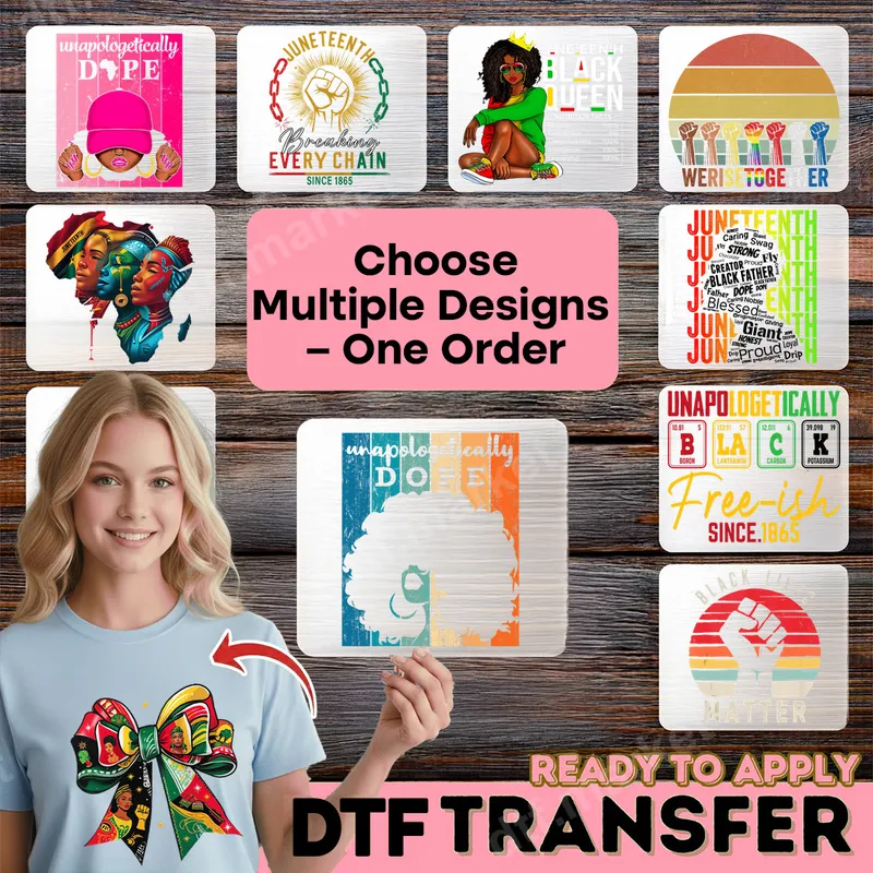 See allThis eye-catching DTF transfer showcases a beautifully designed bow, rich with symbols and colors celebrating Juneteenth and Black heritage. The vibrant red, green, black, and gold hues, alongside empowering imagery like the raised fist and profiles of Black women, embody a spirit of freedom and pride. This premium direct to film transfer is ready to press, making it simple to add a powerful statement to your apparel. Perfect for Juneteenth celebrations, Black History Month events, or everyday wear, this heat press design is for anyone who wants to display their cultural pride. It makes an excellent gift for family, friends, or community members passionate about justice and heritage. Use this iron on transfer to personalize garments for parades, rallies, or thoughtful presents that truly stand out. Our high-quality heat press ready transfer adheres perfectly to a wide range of materials, including cotton, polyester, and various fabric blends. For best results, apply with a heat press at 300-325°F for 15 seconds with medium pressure, then cool peel. While a heat press is recommended for professional results, you can also achieve great results with a household iron. Best of all, there's no tedious weeding required – just press and go! Experience exceptional quality with every shirt design. This durable apparel transfer boasts vivid colors that resist cracking and fading, ensuring your message stays bold wash after wash. The soft-touch finish means your customized garment will be comfortable to wear, providing a professional look and feel that's superior to traditional vinyl transfer options.