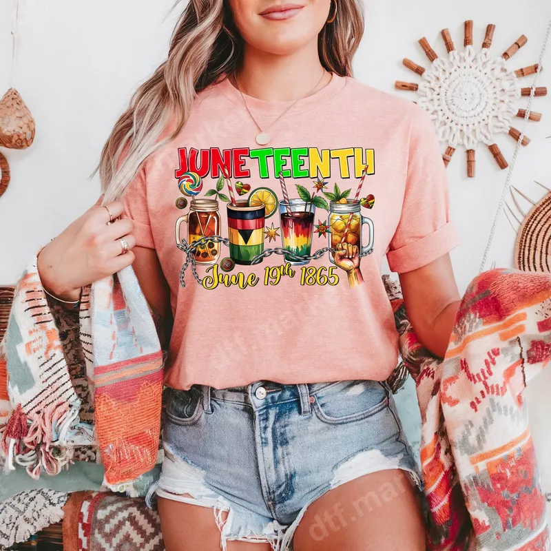 See allThis vibrant Juneteenth DTF transfer celebrates freedom with a powerful and festive design. Featuring 'JUNE TEENTH' prominently displayed in bold, Pan-African flag colors, the artwork showcases four unique beverage glasses adorned with symbols of liberation, including broken chains and a raised fist. Below, 'June 19th 1865' marks the historic date, making this ready to press transfer a meaningful addition to any garment. Perfect for commemorating Juneteenth, this heat press transfer is ideal for anyone celebrating emancipation, Black history, and cultural pride. It makes a thoughtful gift for community leaders, educators, family members, or friends who cherish freedom and justice. Create custom t-shirts for Juneteenth picnics, parades, or educational events, making a strong visual statement of remembrance and hope. Applying this high-quality iron on transfer is simple, whether you're a seasoned crafter or new to garment decoration. It adheres flawlessly to a wide range of fabrics, including cotton, polyester, and their blends. For best results, use a heat press at 300-325°F for 15 seconds with medium pressure, then peel cold. No tedious weeding or layering is required, saving you time and effort. Our direct to film transfer technology ensures your designs are incredibly vibrant, durable, and soft to the touch. This professional-grade apparel transfer is engineered to resist cracking and fading, maintaining its stunning appearance wash after wash. Elevate your wardrobe with a powerful and stylish shirt design that honors history and inspires the future.