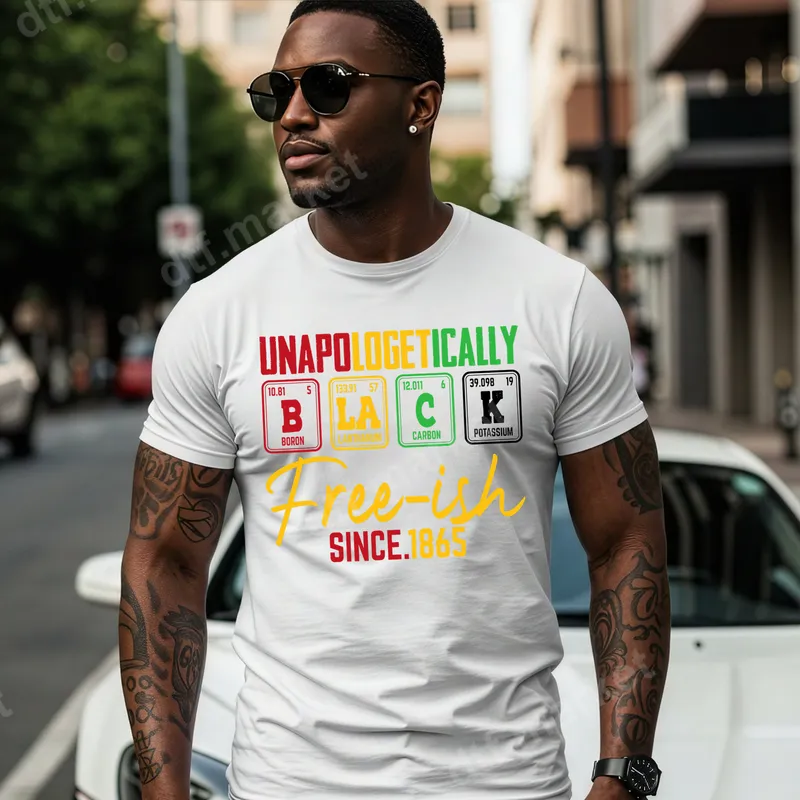 See allEmbrace a powerful message with our "Unapologetically Black Free-ish Since 1865" DTF transfer. This striking design features the word "BLACK" spelled out using periodic table elements (Boron, Lanthanum, Carbon, Potassium) in vibrant Pan-African colors, topped with "UNAPOLOGETICALLY" and finished with a bold "Free-ish SINCE.1865" in script. It's a ready to press DTF transfer that beautifully merges cultural pride with a touch of scientific flair, perfect for making a statement. This powerful heat press design is ideal for anyone celebrating Juneteenth, Black History Month, or simply expressing their unwavering Black pride. It makes an impactful gift for activists, history enthusiasts, or anyone who believes in standing firm in their identity. Wear it to cultural events, protests, family gatherings, or as everyday casual wear to proudly showcase your heritage and journey. Applying this heat press transfer is straightforward for professional and home users alike. It works flawlessly on cotton, polyester, and most fabric blends. Simply use a heat press at 300-325°F for 15 seconds with medium pressure, then perform a cold peel. For those without a heat press, a household iron can also be used following similar guidelines. Best of all, there's no weeding required, making custom apparel creation quick and hassle-free. Our DTF transfers are crafted using premium film and inks, ensuring your apparel transfer is vibrant, crack-resistant, and incredibly soft to the touch. The professional-grade adhesive guarantees a long-lasting finish that withstands washes without fading or peeling, maintaining its crisp details and bold colors. Create custom t-shirts, hoodies, and more with this durable, heat press ready design.