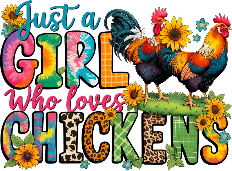 See allThis eye-catching DTF transfer proudly declares "Just a GIRL Who loves CHICKENS" in a lively, eclectic mix of fonts and patterns. Featuring bold tie-dye, leopard print, and checkered block letters, the design is accentuated by two magnificently colorful roosters and cheerful sunflowers, capturing a rustic yet vibrant spirit. This ready to press transfer is perfect for anyone passionate about their feathered friends and brings a touch of farmhouse charm with a modern, playful twist to any garment. This unique heat press design is ideal for chicken enthusiasts, farm owners, homesteaders, or anyone who appreciates the joy of backyard chickens. It makes an excellent gift for mothers, daughters, grandmothers, or friends who love their flock. Perfect for casual wear, farm events, farmers' markets, or simply showing off your chicken devotion daily. Create custom t-shirts, tote bags, or even aprons that celebrate this beloved farm animal. Our high-quality heat transfer applies seamlessly to a wide range of fabric types, including cotton, polyester, and various blends. For best results, use a heat press at 300-325°F for 15 seconds with medium pressure, then perform a cool peel. This iron on transfer requires no weeding, saving you time and effort in your customization projects. You can even use a household iron for smaller applications, making it accessible for everyone to create their personalized apparel. Experience exceptional quality with this durable and vibrant apparel transfer. Printed using professional-grade DTF film and inks, the colors are incredibly vivid, crack-resistant, and offer a soft, smooth feel once applied. Each transfer is designed to withstand numerous washes without fading or peeling, ensuring your personalized garments look fantastic for a long time. This professional-grade direct to film transfer provides a superior finish that rivals screen printing.