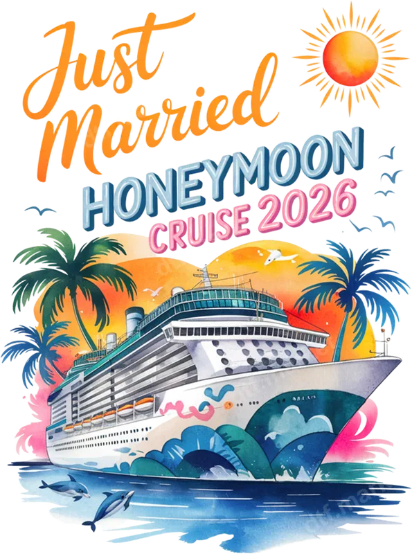 See allThis vibrant "Just Married Honeymoon Cruise 2026" DTF transfer captures the excitement of a romantic getaway. Featuring a majestic cruise ship sailing past lush palm trees with playful dolphins in crystal-clear water, all under a bright sun and colorful sky, this design is the perfect way to commemorate a special journey. It's a high-quality, ready to press transfer, ensuring a beautiful, professional finish on your chosen apparel or accessory. Ideal for newlyweds embarking on their 2026 honeymoon cruise, this unique heat press transfer makes a fantastic keepsake or pre-trip gift. Perfect for couples celebrating their marriage, it’s also great for anniversary trips or anyone who loves tropical cruise vacations. Imagine matching shirts for memorable photos or a unique souvenir to remember your incredible journey. Applying this apparel transfer is simple with a heat press at 300-325°F for 15 seconds with medium pressure, or even a household iron for smaller applications. Our iron on transfers adhere beautifully to a wide range of materials, including cotton, polyester, and their blends. Forget about tedious weeding; this heat press design comes fully prepared, allowing you to quickly and easily create custom garments. Experience superior quality with our professional DTF film, designed for vibrant, long-lasting results. The colors are rich and true to the original artwork, resisting cracks and peels even after multiple washes. The transfer boasts a soft, lightweight feel once applied, ensuring maximum comfort without compromising durability. Give your custom projects a professional edge with these high-grade direct to film transfers.