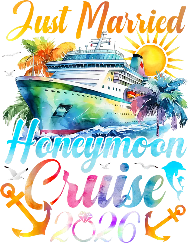 See allThis stunning "Just Married Honeymoon Cruise 2026" DTF transfer captures the excitement of a romantic getaway with its vibrant watercolor cruise ship, sunny skies, and swaying palm trees. Perfect for commemorating your special journey, this ready to press design features playful anchors, a sparkling diamond ring, and dynamic lettering that evokes ocean waves and tropical warmth. It's an ideal choice for creating personalized apparel to celebrate your marriage and upcoming adventure. This beautiful heat press transfer is ideal for newlyweds, engaged couples planning their honeymoon, or friends and family looking for a unique wedding gift. Imagine custom t-shirts for your cruise, matching shirts for a post-wedding party, or personalized totes for beach excursions. It's also fantastic for pre-wedding events like a bridal shower or engagement announcement, allowing you to showcase your love story with a touch of tropical flair. Applying this iron on transfer is simple and efficient, suitable for a wide range of fabrics including cotton, polyester, and their blends. For best results, use a heat press set to 300-325°F for 15 seconds with medium, even pressure. This design ensures vibrant adhesion without the hassle of weeding, making your customization process smooth and enjoyable. It's a quick way to create professional-looking garments right at home or in your workshop. Crafted using premium DTF film and high-quality inks, this apparel transfer promises exceptional durability and a soft, flexible feel. The colors remain brilliant wash after wash, resisting cracking and fading. You'll achieve a professional finish every time, transforming ordinary items into cherished keepsakes that celebrate your "Just Married" status and future cruise memories.
