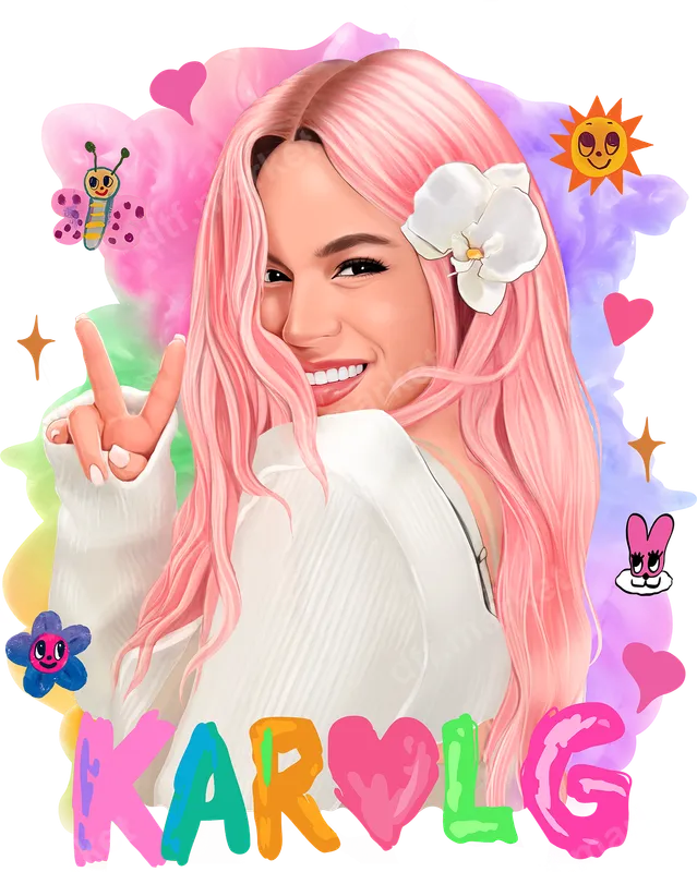 See allThis vibrant DTF transfer captures the essence of Karol G with a stunning pop art illustration featuring her iconic pink hair and a radiant smile, giving a peace sign. Surrounded by colorful, dreamy smoke, whimsical elements like a butterfly, sun, hearts, and stars add to its playful, energetic vibe. Below, the name "KAROL G" is spelled out in bold, multi-colored letters, making this a true fan essential. This high-quality, ready to press transfer is perfect for personalizing apparel with your favorite artist. This Karol G heat transfer is designed for avid fans of the Colombian superstar, reggaeton enthusiasts, and anyone who loves bold, colorful pop culture designs. It's ideal for concerts, music festivals, fan gatherings, or simply showcasing your admiration in everyday wear. A fantastic gift idea for birthdays, holidays, or as a special treat for friends and family who adore Karol G and her "BICHOTA" energy. Applying this apparel transfer is simple and efficient. It works beautifully on a wide range of fabrics, including 100% cotton, polyester, and various cotton/poly blends. For best results, use a heat press at 300-325°F for 15 seconds with medium pressure, then peel cold. A household iron can also be used with firm, even pressure. Unlike traditional vinyl transfers, there's no tedious weeding required, making your customization process quick and hassle-free. Crafted with premium DTF film and professional-grade inks, this custom transfer ensures vibrant colors and crisp details that truly pop. Our advanced printing technology guarantees a soft-to-the-touch finish that feels like part of the fabric, not a heavy patch. Enjoy exceptional durability with a design that is crack-resistant, peel-resistant, and built to withstand countless washes, maintaining its stunning appearance for the long haul.