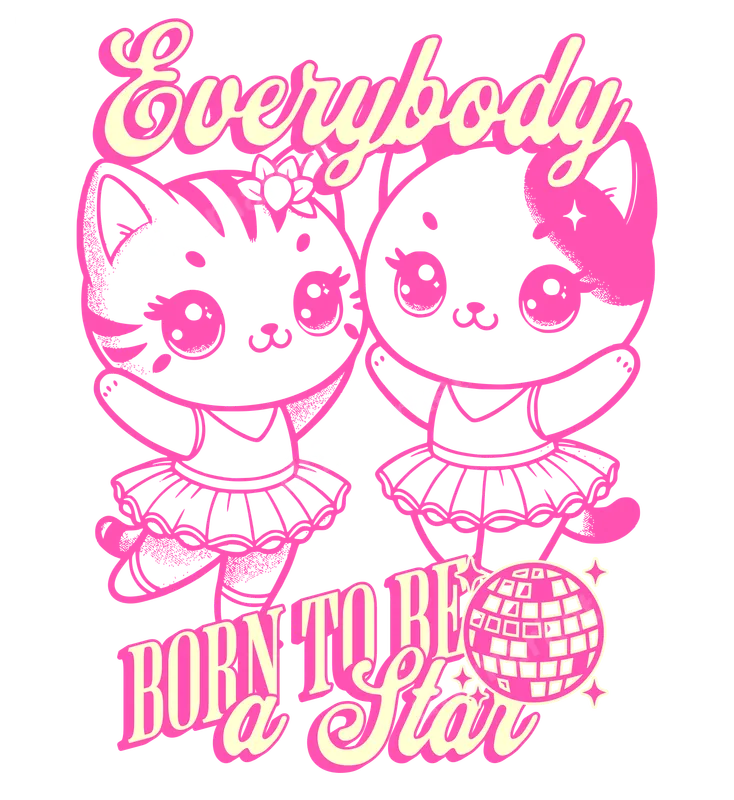 See allThis vibrant direct to film transfer features two charming kawaii-style cats, adorned in adorable ballerina tutus, dancing alongside the uplifting message "Everybody Born To Be a Star." A sparkling disco ball adds a touch of retro glam to this playful design, making it an instant favorite. This DTF transfer is crafted with bright, eye-catching colors, offering a perfect blend of cute aesthetics and a powerful, positive vibe. It's ready to press straight onto your chosen garment, bringing joy and sparkle to any apparel project. Perfect for aspiring dancers, young dreamers, cat lovers, or anyone who believes in shining bright, this heat press design is ideal for creating custom gifts. Imagine it on a personalized birthday shirt, a dance team uniform, a motivational school project, or a unique present for a performer. It's also a fantastic way to add a touch of whimsy and encouragement to everyday wear for kids and adults alike, celebrating individuality and ambition. Applying this versatile ready to press transfer is incredibly simple. It adheres beautifully to a wide range of fabrics including cotton, polyester, and various blends, ensuring durability and a professional finish. For best results, use a heat press at 300-325°F for 15 seconds with medium pressure, then peel cold. A household iron can also be used with careful application. Enjoy the ease of application with no weeding required, making custom apparel accessible. Our premium quality iron on transfer ensures your design remains vibrant and intact wash after wash. Manufactured using professional-grade DTF film, this heat transfer is designed to be highly crack-resistant, providing a soft-touch feel that integrates seamlessly with the fabric. The strong adhesive guarantees a long-lasting application, so your "Born To Be a Star" message will continue to inspire for years to come. Elevate your garments with this durable and visually stunning apparel transfer.