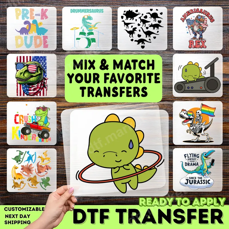 See allThis charming DTF transfer features an irresistibly cute chibi dinosaur attempting to hula hoop, complete with tiny sweat drops suggesting effort or shyness. The vibrant green dinosaur with yellow accents brings a playful, sweet, and slightly humorous vibe to any garment. It's a delightful, ready to press design that captures attention with its endearing character and clean, crisp lines. Perfect for dinosaur lovers of all ages, this heat transfer is an excellent choice for kids' birthday parties, back-to-school outfits, or just everyday playful wear. It makes a fantastic personalized gift for children, toddlers, or anyone who appreciates adorable, whimsical designs. Imagine it on a unique shirt design for a casual day out or a fun family event. Applying this high-quality iron on transfer is a breeze! Designed for versatility, it adheres beautifully to cotton, polyester, and various fabric blends. For best results, use a heat press at 300-325°F for 15 seconds with medium pressure, then peel cold. A household iron can also be used with care. Forget tedious weeding – our direct to film transfer comes perfectly prepared and ready to apply. Experience superior quality with every heat press design. Our DTF transfers are known for their incredibly vibrant colors, exceptional durability, and resistance to cracking or peeling, even after multiple washes. The print feels soft to the touch, seamlessly integrating with the fabric, ensuring a comfortable wear. Each apparel transfer is crafted from professional-grade DTF film with a strong, reliable adhesive for lasting results.