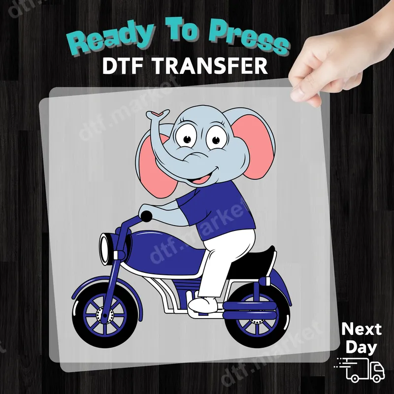 See allAdd a touch of whimsical adventure to any garment with this delightful cartoon elephant DTF transfer. This vibrant design features a cheerful blue elephant, complete with rosy ears and a wide smile, confidently riding a cool blue motorcycle. It’s a truly captivating ready to press design that brings joy and personality to clothing for all ages, but especially the little ones. This adorable heat transfer is perfect for parents, grandparents, or anyone looking to create unique gifts for children. Ideal for birthdays, baby showers, or simply to add a fun, personalized touch to everyday wear, this design is sure to be a favorite. Transform plain t-shirts, onesies, or tote bags into custom apparel that stands out. Applying this professional-grade DTF transfer is incredibly easy, even for beginners. It works flawlessly on cotton, polyester, and various fabric blends. For best results, use a heat press at 300-325°F for 15 seconds with medium pressure, then cold peel the film. No heat press? A household iron can also be used following specific instructions. Best of all, there's no tedious weeding required! Our DTF transfers are crafted with premium materials, ensuring stunning, vibrant colors that resist cracking and peeling, even after multiple washes. The soft-touch finish means the design integrates smoothly with the fabric, providing comfort and durability. Experience professional-quality results with every iron on transfer from dtf.market.