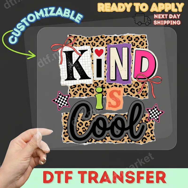See allSpread a positive message with our vibrant "KIND is Cool" DTF transfer! This eye-catching design features a trendy collage aesthetic, combining bold typography with playful elements like leopard print, torn paper textures, a sweet red heart, and edgy checkered stars. Each letter in 'KIND' has a unique pattern and color, creating a distinctive retro yet modern vibe. This direct to film transfer is ready to press, making it simple to infuse your wardrobe with a powerful and stylish statement. This unique heat transfer is perfect for anyone who loves expressing individuality and promoting positivity. Ideal for students, teachers, moms, or fashion-forward individuals, it makes a fantastic statement piece for everyday wear, school events, or casual outings. It's also an excellent gift idea for friends, family, or colleagues who appreciate trendy designs and uplifting messages. Customize apparel for kindness campaigns, youth groups, or simply to add a touch of fun to your personal style. Applying your "KIND is Cool" iron on transfer is quick and easy. Our premium heat press ready design works seamlessly on a wide variety of fabrics, including cotton, polyester, and their blends. For best results, use a heat press at 300-325°F for 15 seconds with medium, even pressure. This durable t-shirt transfer also applies well with a quality household iron, offering flexibility for crafters at any level. Say goodbye to tedious weeding – simply press and peel for a professional finish! Experience superior quality with our professionally printed apparel transfers. Each design boasts incredibly vibrant colors and sharp details that stand out. Engineered to be crack-resistant and soft to the touch, this heat press design ensures lasting durability and comfort on your chosen garment. Crafted from high-quality DTF film with a strong, reliable adhesive, our iron on decals are designed to endure countless washes without fading or peeling, maintaining their fresh look for years to come. Get ready for a premium product that transforms ordinary into extraordinary.