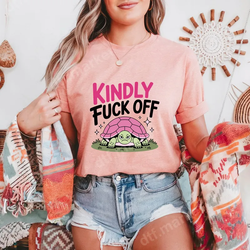 See allGet ready to express your mood with this hilariously blunt "Kindly F*** Off" angry turtle DTF transfer. This vibrant design features a grumpy green turtle with a pink shell, perfectly capturing that "leave me alone" vibe. It's a ready to press design that combines a cute animal with a no-nonsense message, making it a standout graphic for any project. This unique iron on transfer is ideal for those who love sarcastic humor, have a sassy attitude, or simply want to send a clear, funny message. It makes a fantastic gift for friends, family, or even yourself, for birthdays, casual gatherings, or just to add some personality to your everyday wear. Perfect for anyone who appreciates a good laugh with a touch of adult humor. Applying this heat transfer is a breeze! Our professional-grade DTF transfers work beautifully on a wide variety of materials, including 100% cotton, polyester, and cotton/poly blends. Simply use a heat press at 300-325°F for 15 seconds with medium pressure, or apply with a household iron. Best of all, there's no weeding required, saving you time and effort compared to traditional vinyl transfer methods. Experience premium quality with every apparel transfer. Our direct to film transfers boast incredibly vibrant colors that pop, superior stretch, and excellent wash durability. They are crack-resistant, soft to the touch, and designed to last, ensuring your custom creation maintains its professional look wear after wear.