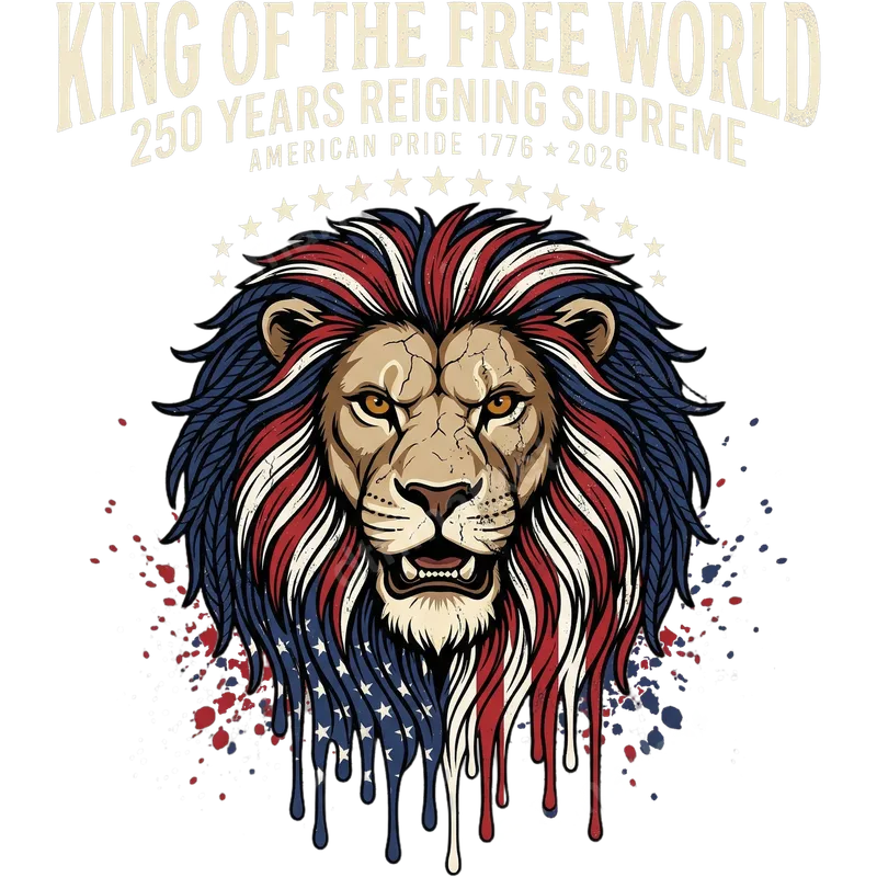 See allThe design features a powerful lion with a majestic mane boldly rendered in the colors and pattern of the American flag, complete with stars and stripes. Below the lion, the text "KING OF THE FREE WORLD," "250 YEARS REIGNING SUPREME," and "AMERICAN PRIDE 1776 * 2026" proudly proclaims a strong message of freedom and national heritage. This striking graphic is a high-quality DTF transfer, meticulously crafted and ready to press onto your chosen garment. This patriotic lion heat transfer is perfect for anyone who cherishes American values, celebrates national holidays like the 4th of July, Memorial Day, or Veterans Day, or simply wants to express their pride in the USA. It makes an excellent gift for veterans, service members, history enthusiasts, or anyone anticipating the nation's 250th anniversary in 2026. Create custom apparel for family gatherings, political rallies, or everyday wear. Applying this heat press design is incredibly simple, making it accessible for both beginners and experienced crafters. Our ready to press transfer works beautifully on a wide variety of materials, including cotton, polyester, and their blends. For best results, apply with a heat press at 300-325°F for 15 seconds with medium, even pressure. Unlike vinyl, there's no weeding required; simply peel and press! For home users, a household iron can also be used with firm, consistent pressure. Experience the superior quality of our professional-grade DTF transfers. This durable t-shirt transfer boasts vibrant colors that pop, offering excellent washability without cracking, peeling, or fading over time. The result is a soft-to-touch design that seamlessly integrates with your fabric, providing a professional finish every time. Elevate your wardrobe with an apparel transfer that combines stunning visuals with lasting performance.