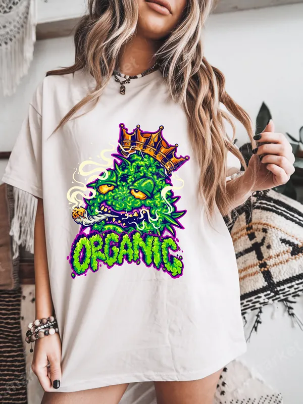 See allThis bold DTF transfer showcases a highly detailed, vibrant green cannabis bud, proudly wearing a golden crown. The "King Organic" bud is depicted smoking a joint, with wisps of smoke adding to its cool, rebellious persona. Below the charismatic character, the word "ORGANIC" is emblazoned in a striking neon green, graffiti-style font with a purple outline. This eye-catching direct to film transfer is ready to press, offering a unique statement piece for any garment. Perfect for cannabis enthusiasts, streetwear aficionados, or anyone who appreciates edgy, alternative graphic designs, this heat transfer makes an excellent gift or a personal style upgrade. Whether you're heading to a music festival, a casual gathering, or just expressing your unique vibe, this ready to press transfer adds an unmistakable element of cool to your wardrobe. It's an ideal choice for birthdays, holidays, or simply celebrating your favorite plant. Applying this versatile heat press design is straightforward and efficient. Our DTF transfers are designed for easy application using a standard heat press at 300-325°F for 15 seconds with medium pressure. It's compatible with a wide range of fabrics, including cotton, polyester, and various blends. Unlike traditional vinyl transfer designs, there's absolutely no weeding required, making your customization process quick and hassle-free. Crafted with professional-grade DTF film and inks, this apparel transfer ensures stunning results. Expect incredibly vibrant colors that pop, superior crack resistance, and a soft, smooth feel on your chosen fabric. These durable iron on decals are built to last, maintaining their visual appeal wash after wash, allowing you to enjoy your custom creation for a long time.