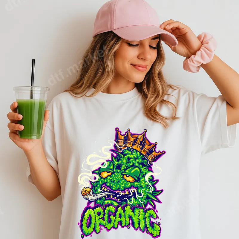 See allThis eye-catching DTF transfer features a vibrant, crowned cannabis bud (nug) enjoying a joint, with wisps of smoke swirling around. Below the regal bud, the word "ORGANIC" is boldly displayed in a gritty, bright green font with purple accents, emphasizing its authentic vibe. This ready to press design is perfect for those who appreciate unique, expressive apparel. Ideal for cannabis connoisseurs, streetwear enthusiasts, and anyone looking to make a bold statement, this custom transfer is great for casual wear, festivals, or gifting to friends who share a similar sense of humor. It's a fantastic choice for 420 celebrations, birthdays, or just adding a touch of edgy personality to your everyday wardrobe. Applying this direct to film transfer is straightforward. It works seamlessly on a wide range of fabrics including cotton, polyester, and their blends. Simply use a heat press at 300-325°F for 15 seconds with medium pressure, then cold peel. For smaller projects, a household iron can also be used, making this a versatile iron on transfer. Best of all, there's no weeding required, making it a quick and easy way to create custom apparel. Our professional-grade DTF transfers deliver exceptional quality. You'll enjoy vibrant colors, excellent wash durability, and a soft-to-the-touch finish that resists cracking and peeling. Each heat press design is printed on premium DTF film with a strong adhesive, ensuring a lasting and professional result on all your personalized items.