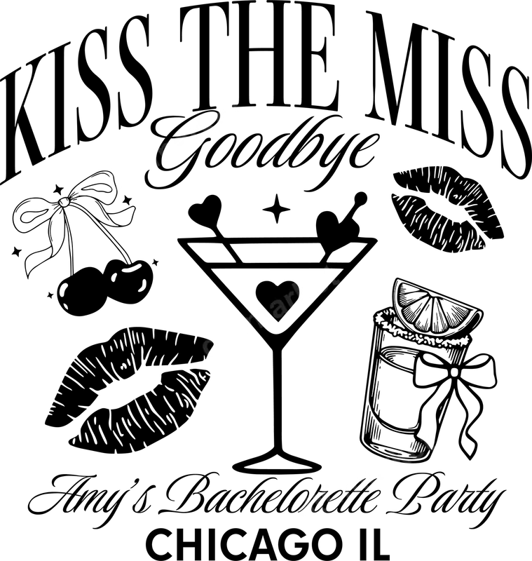 See allCelebrate the bride-to-be with this fun and festive "Kiss The Miss Goodbye" DTF transfer. Featuring playful lips, a chic martini glass, sweet cherries, and a party shot glass, this design is perfect for a memorable bachelorette celebration. The design includes specific event details "Amy's Bachelorette Party CHICAGO IL," making it a fantastic example of a personalized ready to press transfer for your squad. This vibrant design is ideal for bridesmaids, the maid of honor, and the bride herself, perfect for bachelorette parties, bridal showers, or girls' trips. It's an excellent way to create matching custom apparel that everyone will love, serving as a unique keepsake from a special pre-wedding event or even a personalized gift for the bridal party. Applying this heat press transfer is a breeze! It works seamlessly on a wide range of materials, including 100% cotton, polyester, and various fabric blends. Achieve professional results using a heat press at 300-325°F for 15 seconds with medium pressure, or easily apply it with a household iron. Best of all, there's no weeding required, making this iron on transfer incredibly user-friendly for any DIY project. Our DTF transfers are crafted for exceptional quality, offering vibrant colors, impressive durability, and a soft, crack-resistant finish. Each heat press ready design is printed on premium DTF film with a strong adhesive, ensuring your custom t-shirt transfer withstands washes and wear, looking fantastic for years to come. Grab this unique apparel transfer and make your bachelorette party unforgettable.
