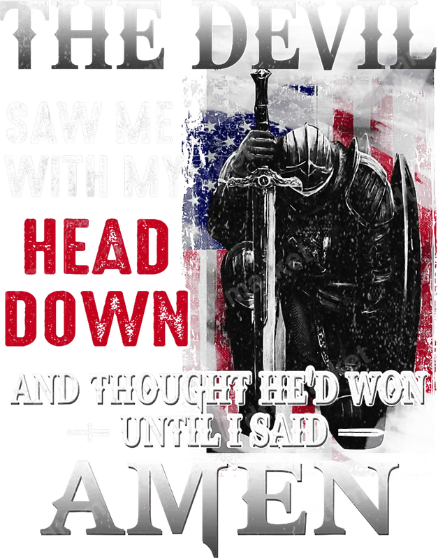 See allUnleash your spiritual strength with this profound DTF transfer, featuring a kneeling knight in full armor, sword in hand, his head bowed in reverence. Behind him, a distressed American flag subtly adds a layer of patriotic grit. The powerful message, “THE DEVIL SAW ME WITH MY HEAD DOWN AND THOUGHT HE'D WON UNTIL I SAID AMEN,” is prominently displayed, making this design a bold declaration of faith and resilience. This heat press ready design is perfect for anyone looking to make a powerful statement. This inspiring design is ideal for Christian men and women, military veterans, and patriotic Americans who embody a warrior spirit in their faith. It makes an excellent gift for baptisms, confirmations, Veteran's Day, or any occasion celebrating perseverance and spiritual triumph. Small businesses specializing in faith-based apparel will find this iron on transfer a powerful addition to their collection, resonating deeply with customers seeking meaningful, expressive garments. Applying this heat press transfer is effortless. It adheres beautifully to a wide range of fabrics including cotton, polyester, cotton-poly blends, and even nylon. For best results, use a heat press at 300-325°F for 15 seconds with medium pressure, or apply with a household iron. There's no tedious weeding required—simply peel and press! It's perfect for creating custom t-shirts, hoodies, sweatshirts, tote bags, denim jackets, and more. For lasting durability, wash garments inside out and tumble dry on low. Experience exceptional quality with this ready to press transfer. It boasts vibrant, full-color printing with intricate detail, ensuring your design truly stands out. Our direct to film transfers are crack-resistant, soft to the touch, and free from the heavy, stiff feel of traditional vinyl. Each transfer is printed on premium DTF film with a strong adhesive backing, guaranteeing professional-grade results that endure wash after wash.