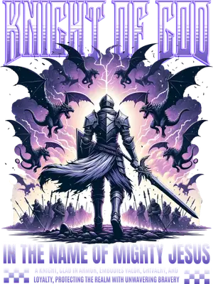 See allThis powerful DTF transfer showcases a valiant knight in radiant armor, standing firm against swirling dragons and lightning-filled skies, embodying unwavering courage. With "KNIGHT OF GOD" above and "IN THE NAME OF MIGHTY JESUS" below, this epic design is a ready to press statement of faith and valor for those who walk with purpose. Ideal for Christian men, women, and youth groups, this bold iron on transfer is perfect for expressing your spiritual journey or sharing an inspirational message. Whether for church events, youth conferences, a personal testament of faith, or a gift for a devoted friend, this heat transfer design makes a profound statement. It's also an excellent choice for Etsy sellers and small t-shirt businesses seeking unique, faith-based apparel designs with a fantasy edge. Applying this heat press transfer is effortless. It adheres beautifully to a wide range of fabrics including cotton, polyester, and cotton-poly blends, and even nylon. Simply use a heat press (300-325°F, 15 seconds, medium pressure) or a household iron. No weeding required—just peel and press for instant results. Perfect for custom t-shirts, hoodies, sweatshirts, tote bags, and denim jackets, offering durable wear. For best results, wash inside out and tumble dry low. Experience superior quality with this ready to press transfer, featuring vibrant, full-color printing and exceptional fine detail that truly brings the knight and dragons to life. The design is crack-resistant and boasts a soft feel, unlike heavy vinyl. Each direct to film transfer is printed on premium DTF film with a robust adhesive backing, ensuring professional-grade results and long-lasting apparel that stands the test of time.
