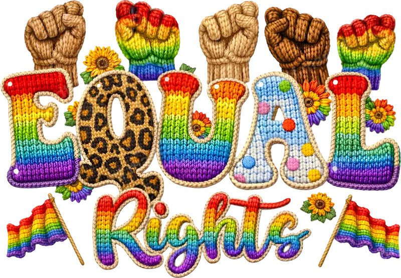 See allThis striking "Equal Rights" DTF transfer beautifully combines powerful symbolism with a cozy, textured aesthetic. Featuring the words "EQUAL Rights" in a charming knit pattern, the design incorporates vibrant rainbow colors, leopard print, and playful polka dots within the letters. Above, diverse knitted fists and cheerful sunflowers underscore a message of unity and celebration. This ready to press heat transfer is perfect for personalizing apparel with a meaningful statement. This heat press ready design is ideal for advocates of diversity, inclusion, and social justice. It’s perfect for Pride Month celebrations, rallies, peaceful protests, community events, or simply expressing your values in everyday wear. Crafters, small business owners, and individuals looking to create unique gifts for friends, family, or fellow activists will find this versatile iron on transfer a powerful choice. Show your support for human rights and equality with this unique apparel transfer. Applying your new direct to film transfer is straightforward and hassle-free. This high-quality ready to press transfer works seamlessly on a wide range of fabrics, including cotton, polyester, and various blends. For best results, use a heat press at 300-325°F for 15 seconds with medium pressure. Even if you don't have a heat press, a household iron can be used with careful application. Enjoy the convenience of a ready-to-use shirt design with no weeding required, making customization quick and easy. Our DTF transfers are crafted using premium materials to ensure exceptional durability and a professional finish. You can expect incredibly vibrant colors that pop and remain brilliant wash after wash, resisting cracking or peeling. The special DTF film provides a soft-to-touch feel, making your customized garments comfortable to wear. With strong adhesive, this apparel transfer ensures a long-lasting bond to your chosen fabric, delivering a high-quality product every time.