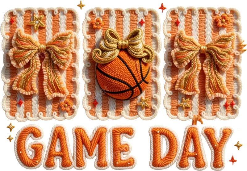 See allCelebrate game day in unique style with this eye-catching "GAME DAY" basketball DTF transfer. This design features a vibrant orange basketball central to a charming knitted or embroidered-style background with playful bows and stars, all rendered in cheerful orange and white stripes. This high-quality DTF transfer is a ready to press transfer, perfect for adding personalized team spirit to any garment or accessory. Its cozy, handcrafted aesthetic truly stands out. This design is ideal for passionate basketball fans, players, and their supportive families. Whether you're a parent cheering from the stands, a student showing school pride, or a coach looking for unique team merchandise, this heat press design is a fantastic choice. It makes a thoughtful gift for birthdays, team events, or simply to show unwavering support during basketball season. Showcase your love for the game with this distinctive transfer. Applying this durable heat press transfer is straightforward for crafters of all levels. For best results, use a heat press at 300-325°F for 15 seconds with medium pressure, then cold peel. You can also achieve great results with a household iron on cotton, polyester, or blended fabrics. Say goodbye to tedious weeding; this iron on decal is ready to go. Create personalized t-shirt transfers, hoodie designs, or tote bags quickly. Crafted using premium DTF film and strong adhesive, this apparel transfer ensures stunning, vibrant colors that resist cracking and fading, even after multiple washes. The soft-touch finish means your customized items remain comfortable without a stiff feel. Enjoy professional-grade results that look and feel amazing, transforming ordinary items into personalized expressions of your game day enthusiasm.