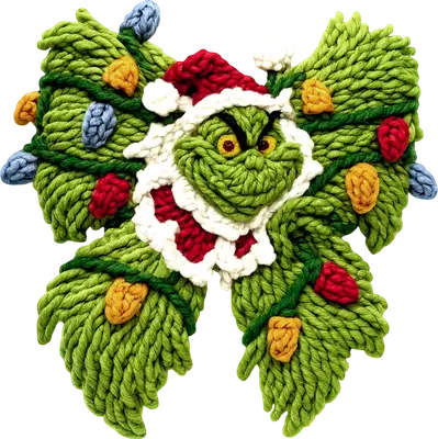 See allUnleash your inner Grinch this holiday season with this uniquely charming DTF transfer, featuring everyone's favorite green anti-hero. The design showcases a grumpy yet festive Grinch face, complete with a Santa hat and beard, all crafted in a cozy, knitted-style texture. This Grinch is cleverly integrated into a large bow shape, adorned with brightly colored Christmas lights, making for a truly eye-catching and ready to press design that perfectly blends mischief with merriment.