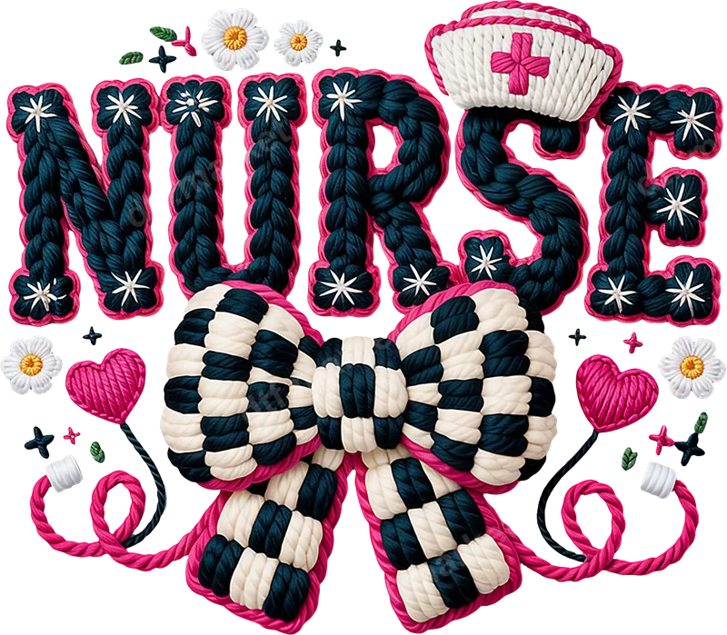Knitted NURSE DTF Transfer with Checkerboard Bow & Nurse Cap