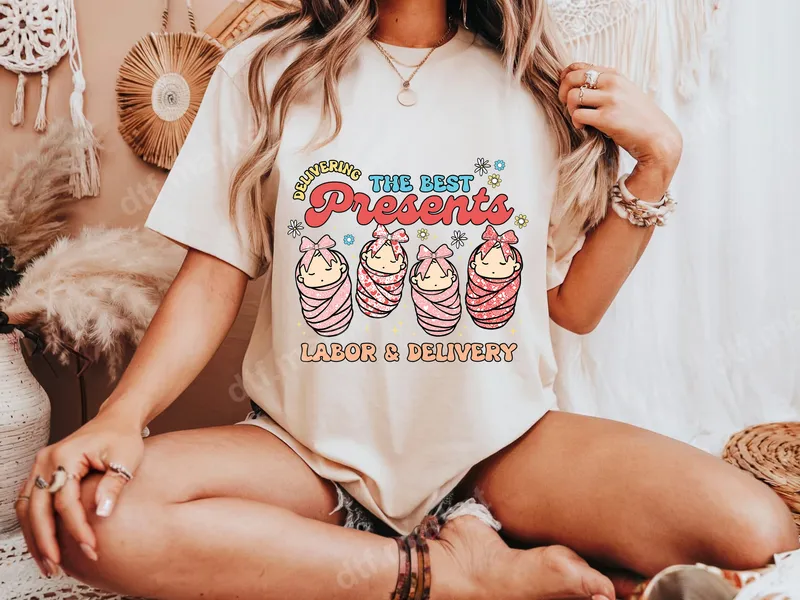See allThis vibrant DTF transfer features four adorable swaddled babies, playfully depicted as "The Best Presents," alongside "Delivering Labor & Delivery." The design has a charming, retro-inspired aesthetic with colorful lettering and floral accents, creating a joyful, celebratory vibe. It's a perfect ready to press design to commemorate new life. This delightful heat transfer is ideal for labor and delivery nurses, OBGYN professionals, midwives, and expectant mothers. It makes a thoughtful gift for baby showers, new parent celebrations, Nurses Week, or to show appreciation for those who help deliver precious new arrivals. Create custom apparel for maternity photoshoots or memorable keepsakes for new moms. Applying this high-quality iron on transfer is simple. It's designed for effortless application on cotton, polyester, and various blends. Achieve professional results using a heat press at 300-325°F for 15 seconds with medium pressure, or with a household iron. No complex weeding or layering is required, making customization a breeze. Our DTF transfers use premium materials, ensuring vibrant colors and exceptional durability. The design is crack-resistant, peel-resistant, and maintains a soft, flexible feel on your garment. Each direct to film transfer is produced with professional-grade film and strong adhesive, guaranteeing a long-lasting, high-quality shirt design that withstands countless washes.