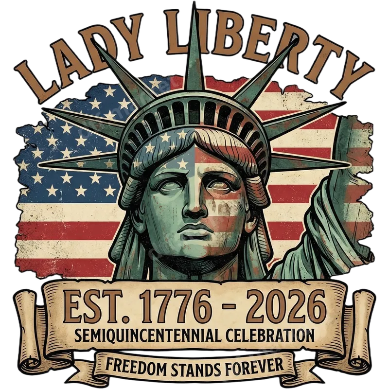 See allThis impactful DTF transfer showcases a distressed rendition of Lady Liberty, her face subtly incorporating the iconic stars and stripes of the American flag. Behind her, a rugged flag unfurls, completing a powerful patriotic scene. Bold lettering proudly declares "LADY LIBERTY" above, with a scroll banner below marking "EST. 1776 - 2026 SEMIQUINCENTENNIAL CELEBRATION" and "FREEDOM STANDS FOREVER." This ready to press design is perfect for commemorating America's 250th anniversary. Ideal for patriots, veterans, and history enthusiasts, this design makes a striking statement on any garment. It's perfect for Fourth of July celebrations, Memorial Day events, Veterans Day tributes, or as a thoughtful gift for anyone who cherishes American freedom. Create custom apparel for family reunions, commemorative events, or simply to express your national pride with this versatile heat press design. Applying this direct to film transfer is straightforward. It works seamlessly on a wide range of materials, including cotton, polyester, and various fabric blends. For best results, use a heat press at 300-325°F for 15 seconds with medium pressure, then peel cold. No complex weeding is required, making your customization process quick and efficient. You can even use a household iron, following included instructions for success. Our professional-grade DTF transfers deliver exceptional quality. Expect vibrant, full-color designs that are crack-resistant, washable, and incredibly soft to the touch. Each heat transfer is printed on premium DTF film with a strong, consistent adhesive, ensuring a durable and professional finish every time. Elevate your garments with this high-quality, long-lasting iron on decal.