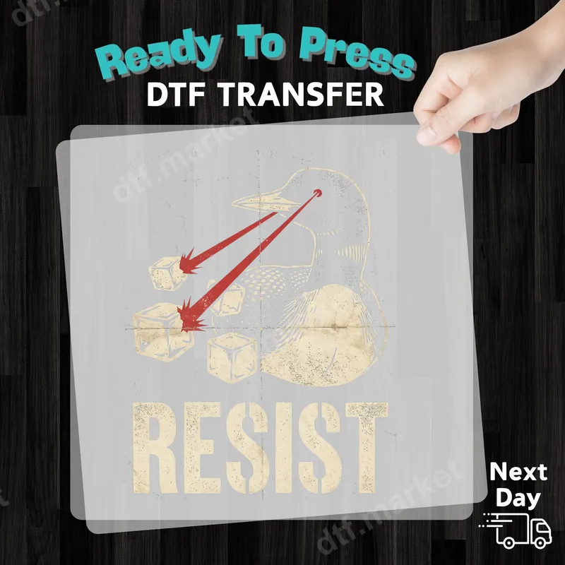 See allThis unique DTF transfer features a vintage-style loon (or duck-like bird) shooting intense red laser beams from its eyes, targeting and shattering ice cubes. Below this absurdly cool scene, the word "RESIST" is emblazoned in a distressed, stencil font, adding a layer of ironic and humorous defiance. This ready to press design combines retro aesthetics with a modern, sarcastic sensibility, perfect for those who appreciate quirky art. This heat transfer is ideal for anyone with a sarcastic sense of humor, nature lovers with an edgy twist, or those who simply enjoy unique graphic apparel. It makes a fantastic gift for friends, family, or even yourself, for birthdays, casual outings, or just to add personality to everyday wear. Stand out at social gatherings, festivals, or while running errands with this conversation-starting iron on transfer. Our high-quality heat press transfers are incredibly versatile and can be applied seamlessly to a wide range of fabrics, including cotton, polyester, and various blends. For best results, use a heat press at 300-325°F for 15 seconds with medium pressure. While a heat press is recommended, this easy-to-use t-shirt transfer can also be applied with a household iron. Enjoy the convenience of no weeding required, making your customization process quick and effortless. Experience vibrant colors, exceptional durability, and a soft-to-touch finish with every application. Each direct to film transfer is produced using professional-grade DTF film and inks, ensuring crack-resistant designs that withstand countless washes. The strong adhesive on our apparel transfer provides a lasting bond, making sure your custom creations look fantastic for years to come.