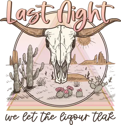 See allThis unique DTF transfer captures the spirit of a wild desert night with its striking cow skull at the center of a rustic landscape. Featuring cacti, blooming prickly pears, and distant mesa formations under a pale sun, the design is framed by subtle geometric lines and a soft, muted color palette. The playful cursive text "Last Night" above and "we let the liquor leak" below adds cheeky humor, making this **ready to press** design perfect for those with a fun-loving, free-spirited western or boho aesthetic. This design is perfect for country music enthusiasts, western fashion lovers, or anyone with a dry sense of humor. Ideal for bachelorette parties, girls' trips to Nashville, rodeo events, or a casual night out with friends. It makes a fantastic gift for birthdays, holidays, or a fun surprise for your favorite party animal. Small t-shirt businesses and crafters looking for unique **iron on transfer** designs will find this a popular choice, appealing to customers who love rustic charm and playful wit. Applying this **heat press transfer** is quick and easy, perfect for DIY projects or commercial use. It adheres beautifully to cotton, polyester, blends, and even nylon. Use a heat press at 300-325°F for 15 seconds with medium pressure, or apply with a household iron. No weeding required—just peel and press. Create **custom t-shirts**, hoodies, tote bags, or denim jackets with professional, lasting results. For best care, wash garments inside out and tumble dry on low. Experience exceptional quality with this **ready to press transfer**, boasting vibrant, full-color printing and remarkable fine detail. The design is crack-resistant and feels soft to the touch, avoiding the heavy, stiff feel of vinyl transfers. Each **direct to film transfer** is meticulously printed on premium DTF film, featuring a strong adhesive backing to ensure smooth, professional application and superior durability that stands the test of time, wash after wash.