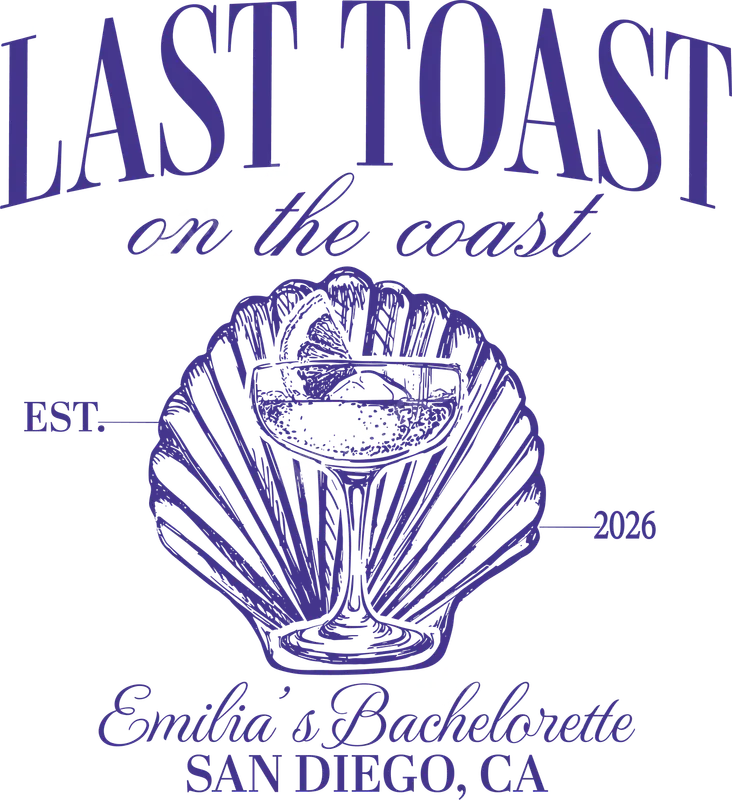 See allThis vibrant "Last Toast On The Coast" DTF transfer captures the perfect bachelorette party spirit. Featuring elegant script and serif fonts, the design showcases a classic cocktail glass nestled in a detailed seashell, signifying coastal celebrations. This ready to press DTF transfer is ideal for commemorating "Emilia's Bachelorette" in "San Diego, CA," established for 2026, setting a stylish, beachy vibe. This custom heat transfer is specifically designed for brides-to-be, bridesmaids, and friends celebrating a bachelorette party, especially in San Diego or any coastal destination. It's perfect for creating matching "Last Toast On The Coast" shirts, tote bags, or hats for the entire bride tribe, making a fantastic keepsake or thoughtful gift. Applying this direct to film transfer is incredibly easy, ensuring professional results every time. Our high-quality heat press transfer works flawlessly on a wide range of fabrics, including cotton, polyester, and cotton/poly blends. For best results, use a heat press at 300-325°F for 15 seconds with medium pressure, followed by a cool peel. No more tedious weeding like with traditional vinyl transfers; simply press and enjoy your custom apparel. Experience superior quality with our premium DTF transfers. Each iron on transfer is engineered for exceptional vibrancy, ensuring the beautiful purple hues and intricate details truly pop. They are crack-resistant, incredibly durable, and boast a soft, lightweight feel that won't compromise comfort. Crafted with professional DTF film and strong adhesive, these apparel transfers are built to last through all your celebrations.