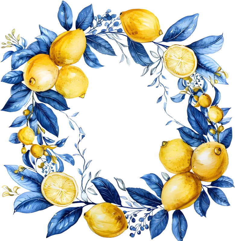 Lemon & Blue Foliage Wreath DTF Transfer | Botanical Heat Press Design
