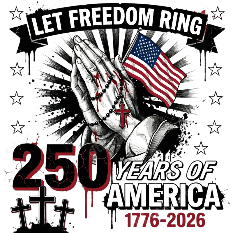See allThis powerful DTF transfer commemorates "250 Years of America" from 1776-2026, emblazoned with the stirring call "Let Freedom Ring." The design features reverently clasped praying hands, adorned with a rosary and symbolic blood, alongside a waving American flag. Three solemn crosses anchor the base, creating a deeply patriotic and faith-inspired image that honors sacrifice and liberty. This high-quality, ready to press transfer allows you to easily personalize your apparel with a meaningful statement of national and spiritual pride. This unique design is perfect for patriots, veterans, and individuals who deeply value both their faith and their country's heritage. It serves as an ideal statement piece for significant national holidays such as the 4th of July, Memorial Day, and Veterans Day. Whether you're attending a patriotic event, a church gathering, or simply want to express your devotion to liberty and belief, this design resonates deeply. It also makes a thoughtful gift for family and friends who share a strong sense of national pride and spiritual conviction. Applying this vibrant heat press transfer is straightforward, suitable for a wide range of materials including cotton, polyester, and various fabric blends. For best results, use a heat press at 300-325°F for 15 seconds with medium, even pressure. While a heat press is recommended for professional application, it can also be carefully applied with a household iron. One of the greatest advantages is that there's no weeding or masking required, saving you significant time and effort compared to traditional vinyl. This truly is a convenient iron on transfer solution. Our DTF transfers are crafted using professional-grade film and inks, ensuring exceptional vibrancy and crisp detail that stands out on any garment. The result is a durable t-shirt transfer that is crack-resistant, peel-resistant, and maintains its vivid colors wash after wash. You'll appreciate the soft, flexible feel on your fabric, unlike rigid vinyl. With a strong adhesive backing, these transfers bond seamlessly, providing a long-lasting and high-quality finish for all your apparel customization projects.
