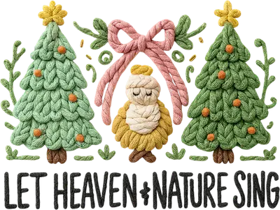 See allEmbrace the warmth of the holiday season with this charming "Let Heaven & Nature Sing" DTF transfer. The design features beautifully rendered knitted-style Christmas trees adorned with subtle orange baubles and yellow star toppers, flanking a serene, knitted angel figure. Delicate pink bows and green foliage accents complete the cozy aesthetic, while the inspiring phrase "LET HEAVEN & NATURE SING" anchors the design in a textured font. This exquisite design is a ready to press transfer, perfect for adding a touch of handmade charm to your festive creations. This delightful design is perfect for families celebrating Christmas, crafters looking to personalize holiday projects, and small businesses creating unique seasonal apparel. It makes a wonderful iron on transfer for matching family shirts, thoughtful Christmas gifts for loved ones, or charming outfits for holiday parties and church events. Use this heat transfer design to spread joy and festive cheer, whether for personal use or to stock your boutique with heartwarming products. Applying this heat press transfer is simple and efficient, working beautifully on a variety of materials including cotton, polyester, and blends. For best results, use a heat press at 300-325°F for 15 seconds with medium pressure, or apply with a household iron. There's no tedious weeding required – just peel and press! It's ideal for custom t-shirts, cozy hoodies, sweatshirts, tote bags, festive pillow covers, baby onesies, aprons, and even denim jackets. For lasting durability, wash garments inside out and tumble dry on low. Our ready to press transfer ensures vibrant, full-color printing with exceptional detail, capturing the intricate knitted texture perfectly. It’s crack-resistant and soft to the touch, avoiding the heavy, stiff feel often associated with vinyl transfers. Each direct to film transfer is printed on premium DTF film with a strong, reliable adhesive backing, guaranteeing professional-quality results for every application.