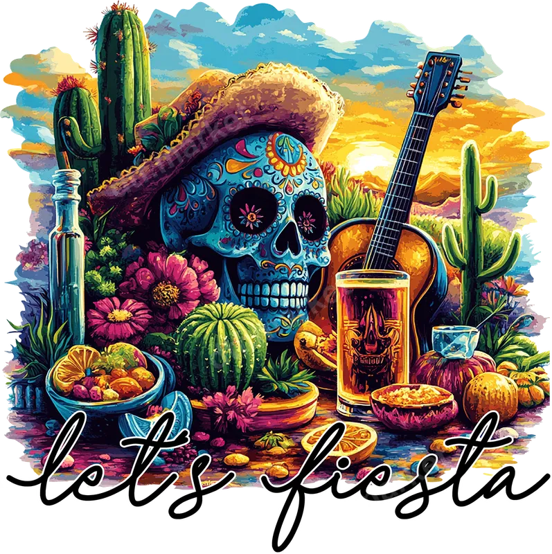 Let's Fiesta Sugar Skull DTF Transfer | Mexican Celebration Guitar Cactus Design