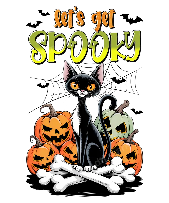 See allThis eye-catching "Let's Get Spooky" DTF transfer features a classic black cat perched playfully on crossed bones, surrounded by an assortment of grinning jack-o'-lanterns and eerie spiderwebs. Flying bats complete the festive, spooky scene, all topped with bold, gradient lettering that says "let's get SPOOKY." This vibrant, ready to press design perfectly captures the fun and mischievous spirit of Halloween, making it an ideal choice for anyone looking to add some festive flair to their apparel. This heat press transfer is perfect for Halloween enthusiasts, cat lovers, and anyone who enjoys celebrating the spooky season. It's an excellent choice for costume parties, trick-or-treating outfits, school events, fall festivals, or simply showing off your Halloween spirit throughout October. Use it to create unique gifts for friends, family, or even fellow spooky season fanatics, turning ordinary garments into personalized, festive statements. Applying this apparel transfer is incredibly easy, making it suitable for both professional use and DIY crafters. Our high-quality direct to film transfer adheres seamlessly to a wide range of fabrics, including cotton, polyester, and various blends. For best results, use a heat press at 300-325°F for 15 seconds with medium pressure, followed by a cool peel. It can also be applied with a household iron. Best of all, there's absolutely no weeding required, saving you time and effort. Experience superior quality with this durable iron on transfer. The colors are incredibly vibrant and sharp, ensuring your design pops on any garment. Engineered to be crack-resistant and long-lasting, it withstands numerous washes without fading or peeling. The print boasts a soft, flexible feel, seamlessly blending with the fabric. Made with professional-grade DTF film and strong adhesive, this heat transfer promises a premium, professional finish every time.