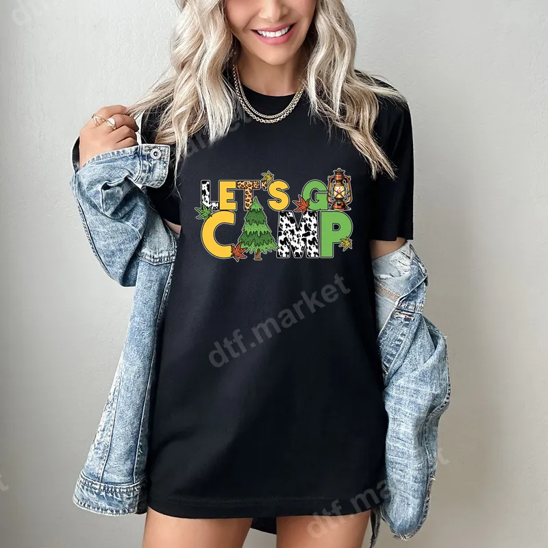 See allEmbark on your next adventure with our vibrant 'Let's Go Camp' DTF transfer! This playful design features each letter uniquely styled: 'L', 'T', 'M' in classic cow print, 'E' in trendy leopard print, 'A' as a festive green pine tree, 'O' as a charming camping lantern, and other letters accented with warm yellow, green, and scattered fall leaves. It’s a striking, ready to press design that captures the spirit of the great outdoors. This high-quality heat transfer is perfect for anyone who loves camping, hiking, or simply enjoys the beauty of nature. It makes an excellent addition to your personal gear for family camping trips, outdoor festivals, or as a thoughtful gift for the wilderness enthusiast in your life. Create unique apparel for your next glamping getaway or a cozy campfire evening. Applying this iron on transfer is straightforward for professional results. For best adherence, use a heat press at 300-325°F for 15 seconds with medium pressure. Peel the film cool after pressing. For household irons, apply firm, even pressure for 20-30 seconds. This versatile t-shirt transfer works flawlessly on cotton, polyester, and blend fabrics, and requires no weeding, saving you time and effort. Our professional-grade DTF transfers ensure bright, crisp colors and superior durability. The design is crack-resistant, peel-resistant, and feels soft to the touch, integrating seamlessly with your garment. Elevate your wardrobe with this charming apparel transfer, designed to withstand countless washes while maintaining its vibrant appeal.